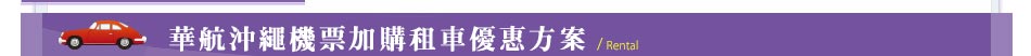 購買沖繩機票前,先告知客服人員加購此租車優惠方案● Car Rental:OTS租車公司(沖繩旅遊社租車部 Okinawa Tourist Rent A Car)車輛使用 |