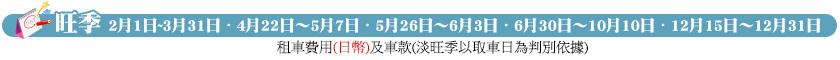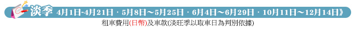※當地可加購豪華安心險,一日1080日元(發生事故沒有自付額)。 安心保險一日540日元(發生事故將會有部分自付額產生)。 |