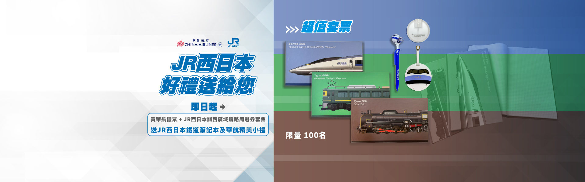 加碼好禮:即日起至2023/03/31日凡開立CI+JR西日本套票,即贈送JR鐵道筆記本組及華航精選好禮(酒精瓶、飛機行李吊牌或飛機造型廻力筆,隨機贈送)(限量100組,送完為止)
