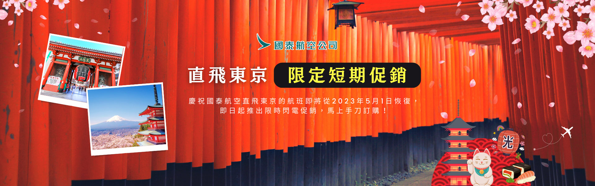 慶祝國泰航空直飛東京的航班即將從2023年5月1日恢復,即日起推出限時閃電促銷,馬上手刀訂購!