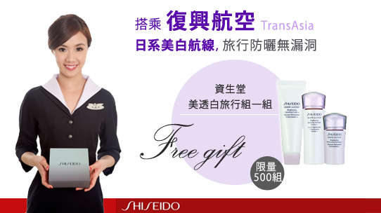 1.活動期間內凡搭乘復興航空上述航線之商務艙旅客,於桃園復興航空櫃台辦理搭機報到時,即可領取資生堂美透白旅行組一組