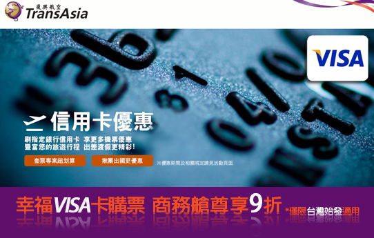 使用VISA卡於東南旅行社購買復興航空台灣始發之國際、兩岸航線商務艙來回機票,即享票價9折優惠。