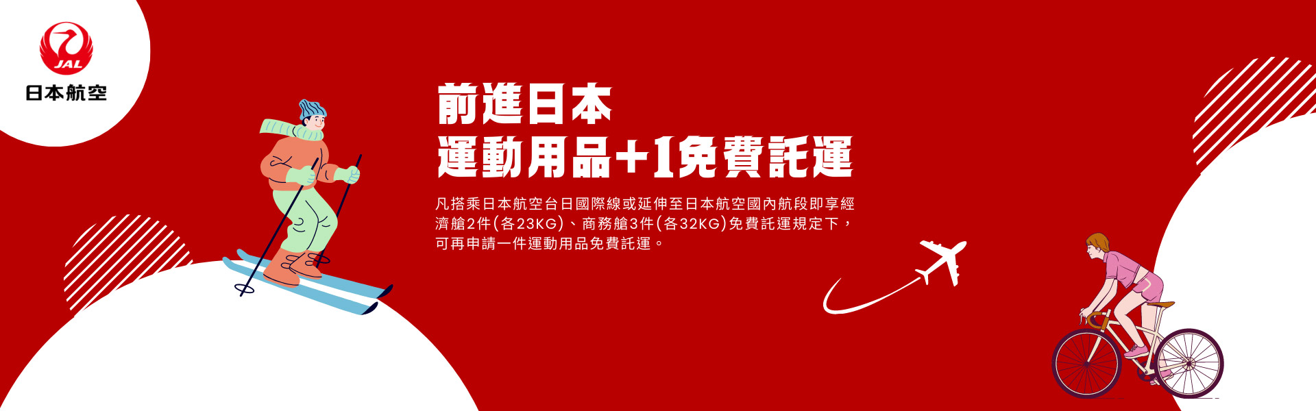 凡搭乘日本航空台日國際線或延伸至日本航空國內航段即享經濟艙2件(各23KG)、商務艙3件(各32KG)免費託運規定下,可再申請一件運動用品免費託運。