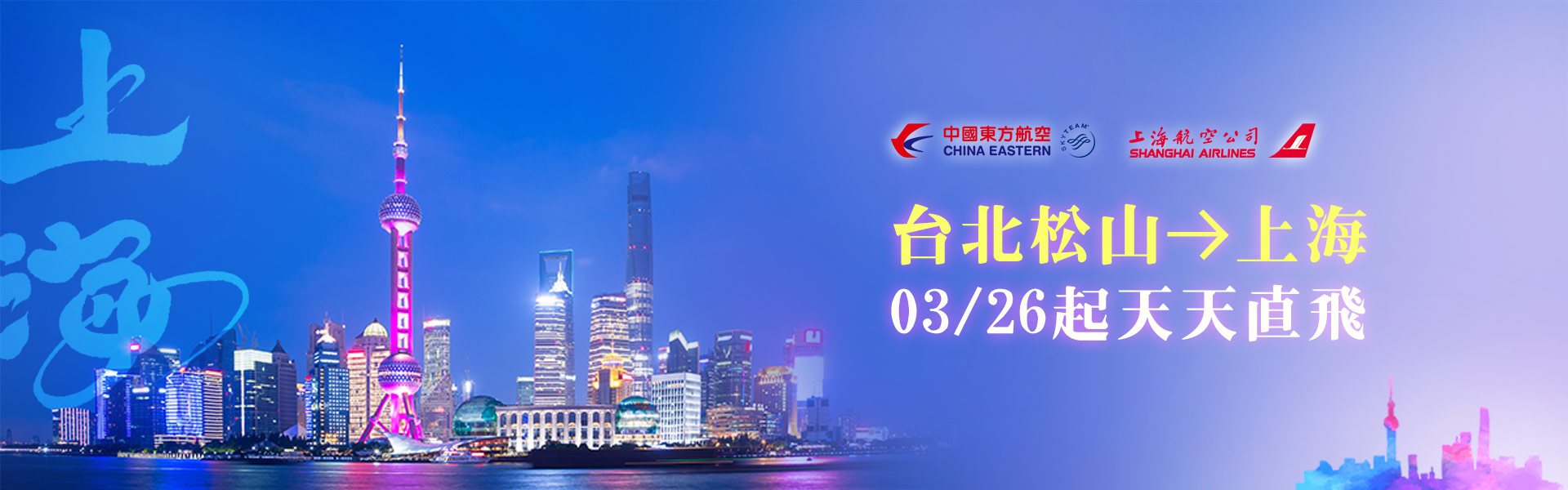 中國東方航空自2023/03/26日起恢復松山至上海(虹橋/浦東)往返航班,加上原有桃園-上海(浦東/虹橋)每日航班,將提供每週33班台北往返上海航班服務,再經由上海可飛往內陸多達205個城市,是旅客的最佳選擇!東航熱切期待與您再次起飛~