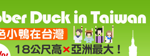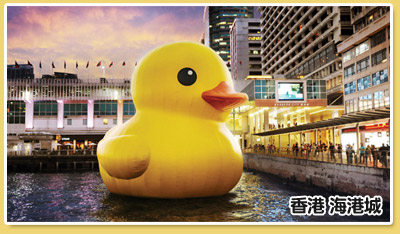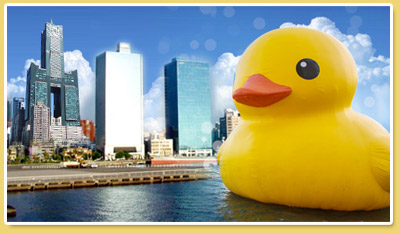 黃色小鴨(Rubber Duck)從香港「游」到台灣的第一站高雄!9月19日至10月20日將在高雄高雄光榮碼頭展出,黃色小鴨高18公尺、約6層樓高,浮台底座直徑15公尺,是亞洲最大、世界第二大的作品,將成為台灣最大型的水上公共藝術。