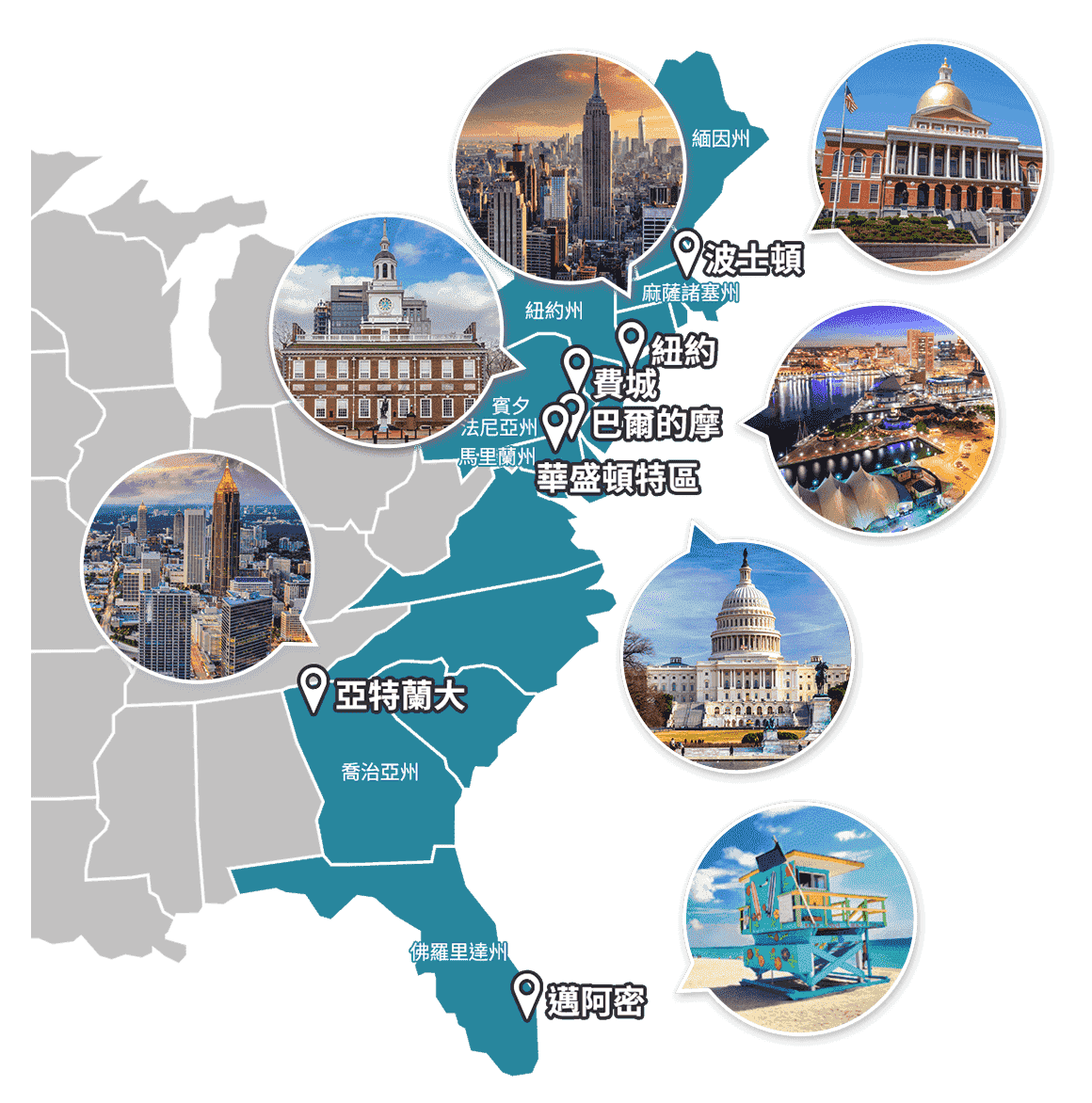 紐約、費城、華盛頓、波士頓等城市,更是首屈一指的指標都市。