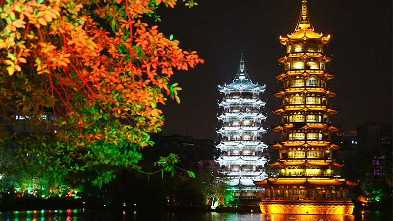 日月雙塔從湖中拔出水面,銅鑄的金色「日塔」,共有9層41米高,琉璃製的銀色「月塔」只有7層35米高,據說擁有三項之最的紀錄:「世界最高的銅塔,世界最高的銅製建築物,世界最高的水中塔」,在紀錄上的出類拔萃,使日月雙塔成為桂林市區最醒目的建築。