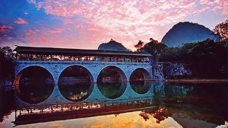 為世界上最大、保存完整的風雨橋。是中國木建築中的藝術珍品,長64公尺,共有四個橋孔五個橋墩,橋梁不使用一釘一鉚,皆以大小條木鑿木銜接而成,在每個橋墩上都建有多角塔形亭子,飛簷高翹,猶如羽翼舒展,橋的壁柱、瓦簷、雕花刻畫,富麗堂皇,整座橋雄偉壯觀。