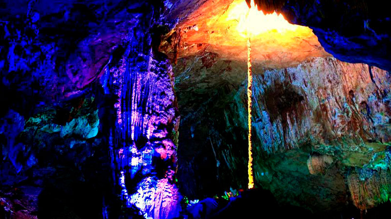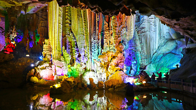 因為岩內的清水河盛產油豐魚而得名。這是一個非常奇特的大溶洞,它貫穿九座大山,全長有5.3公里,洞中小廳連著大廳,其中最大的廳竟有25,500多平方米,另外還有一條2.3公里的地下河,因而得到了「一洞穿九山,暗河漂十里」的美譽。洞中石幔、石柱、石筍林立,燦爛繽紛,令人目不暇接。