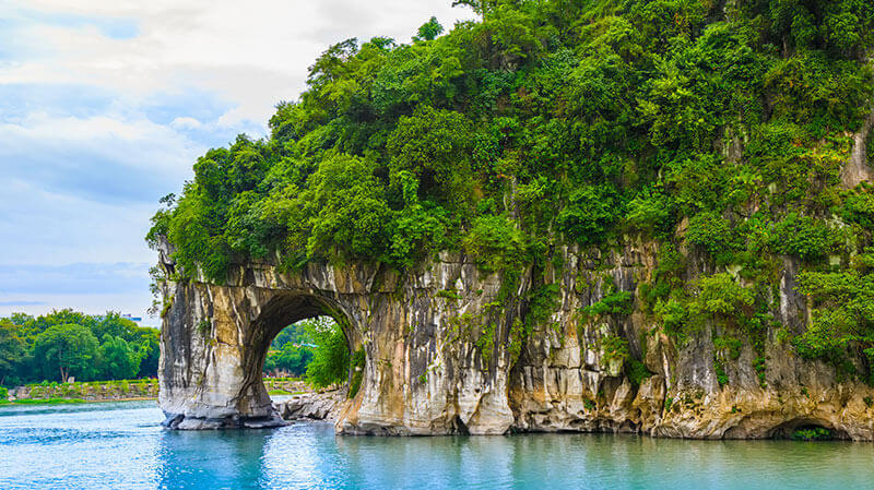 象山公園位於市區桃花江與灕江匯流處,轄以象鼻山為主體的山石洞穴,亭樓寺院,園林綠化園地,總麵積2.99公頃。整座山象一隻大象站在江邊伸長鼻子吸水,尤以鼻象最為突出,遠看近看都很逼真。山下有著名的水月洞,它是象鼻和象身之間的一個溜圓的大洞。每當月明之夜,看水月洞倒影,酷似皎月浮江,景色奇絕。