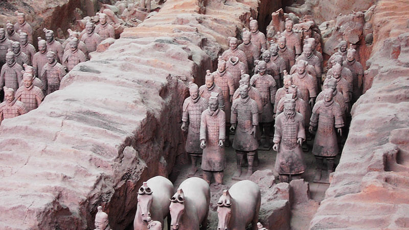 兵馬俑坑是秦始皇陵的陪葬坑之一,象徵秦始皇的無敵大軍,自1974年陜西農民在打井時挖到陶俑俑頭開始,兵馬俑就一直深受全球考古學界的重視。1979年秦始皇兵馬俑博物館正式開館對外展出,出土的秦俑數量繁多,三個坑出土近8千多件陶俑、陶馬這巨作在世界雕塑史可謂藝枝獨秀。