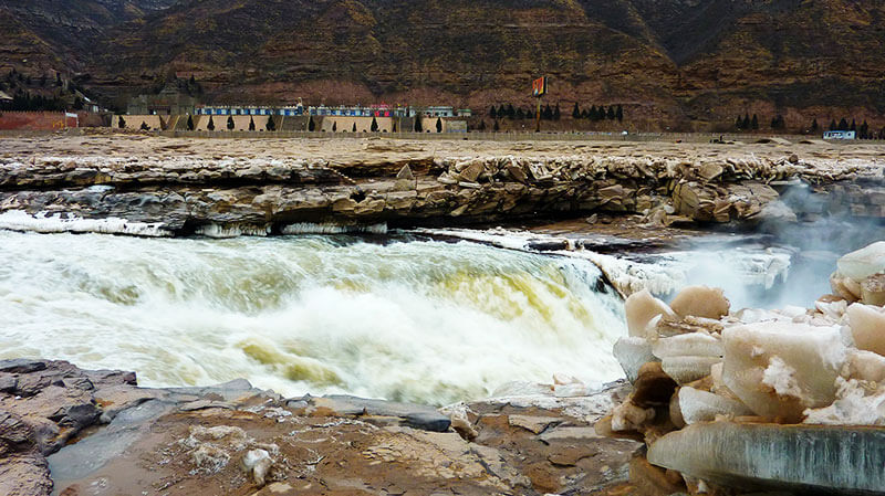 壺口瀑布是黃河中游流經晉陝大峽谷時形成的一個天然瀑布,是中國僅次於貴州省黃果樹瀑布的第二大瀑布。滾滾黃河水流至此,500餘米寬的洪流驟然被兩岸所束縛,上寬下窄,在50米的落差中翻騰傾湧,聲勢如同在巨大無比的壺中傾出,故名“壺口瀑布”。兩大著名奇景“旱地行船”和“水裏冒煙”更是罕見。