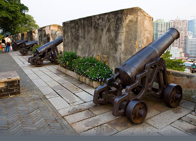 東望洋炮台位於東望洋山之巔,是澳門半島的最高點,松山炮台原來主要用於防禦外來入侵和作為觀察站。在聖母雪志殿教堂內發現了華南地區罕見的壁畫。這些壁畫糅合了中西文化的特色,具有極高的藝術價值。