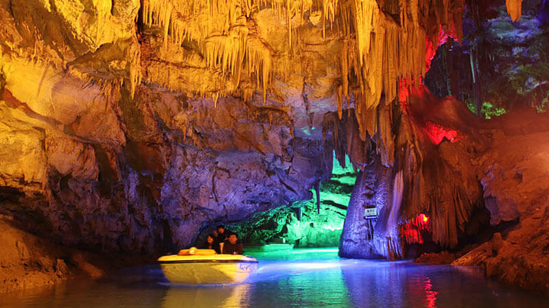 本溪水洞是世界第一長的大型地下充水溶洞,數百萬年前因地殼變動而形成。景區風景集山、水、洞、泉、湖、林等自然景觀和寺廟、古人類遺址等人文景觀於一體。水洞中設有投射燈,使主題岩石更加璀璨耀眼,燈光所及,水中遊船、洞中石景倒映水面,使人如入仙境。