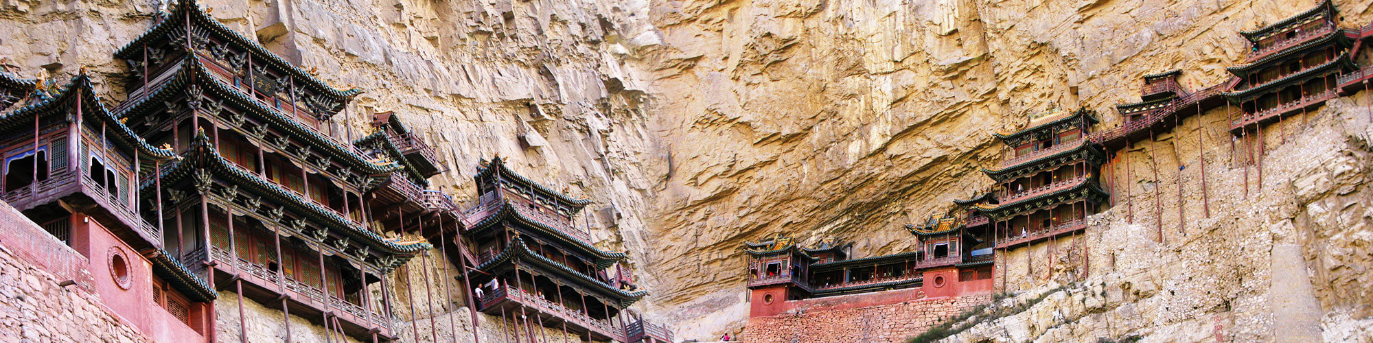 千年屹立天上的寺院 建造於恆山金龍峽西側翠屏峰的峭壁間,素有「懸空寺,半天高,三根馬尾空中吊」的俚語,以如臨深淵的險峻而著稱。曾入選美國《時代周刊》世界十大最危險建築,懸空寺表面上只是由十幾根的木柱支撐,使其外貌驚險、奇特、壯觀。