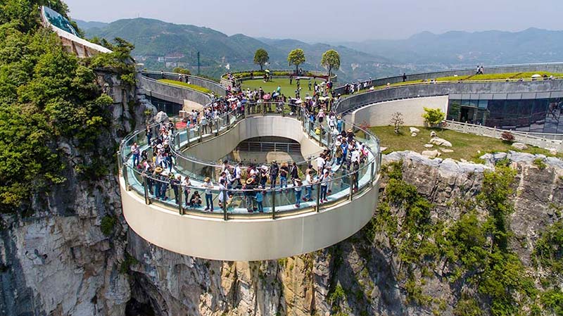 為世界第一懸挑玻璃廊橋,建在海拔1010米高的懸崖上,懸崖垂直高度718米,懸挑長度26.68米,比美國科羅拉多大峽谷玻璃廊橋懸挑長度還長5米多。橋面、護欄採用三層夾膠全通透超白玻璃,藉助通透玻璃,遊客可720度全景式俯瞰龍缸美景。廊橋主體結構可抗8級地震、14級颱風。