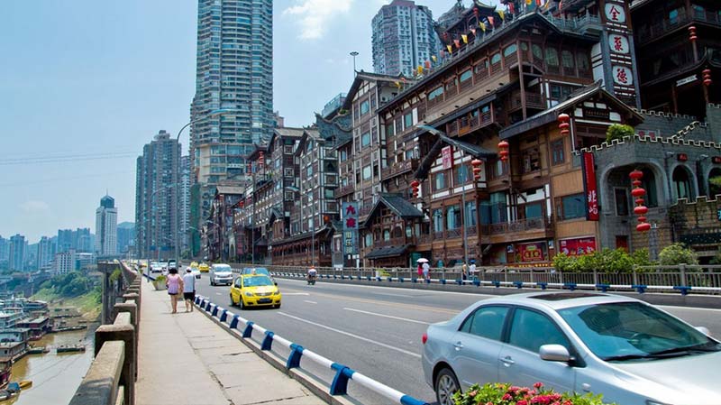 位於重慶市核心商圈長江跟嘉陵江交會處,坐擁城市旅遊景觀、商務休閒景觀和城市人文景觀於一體。當地人為了在長江、嘉陵江邊討生活,緊靠山壁開闢出如「吊腳樓」一般的居住空間,可以防濕氣也可以防蚊蟲,現在則是當地大啖美食與賞長江景,體驗巴蜀文化最好的地方。