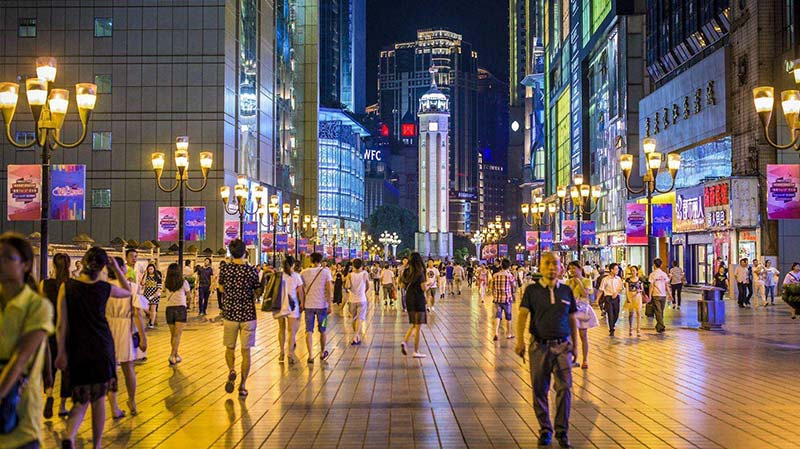 是重慶最繁華的商業圈,這裡百貨公司、酒飯店數量眾多,是購物、美食和走走逛逛的好去處。1997年重慶市渝中區政府投資改造中國第一條商業步行街。民眾所熟悉的火鍋、美女、索道等印象,通通在解放碑附近可以看到。