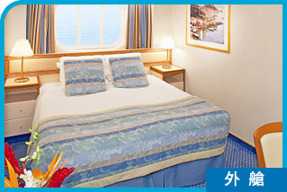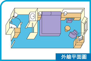 Oceanview Cabin 艙內備有可合併為一張大號雙人床的單人床、冰箱、電視、衣櫥、浴室(附淋浴設備)。