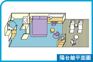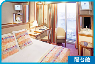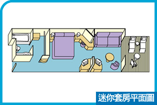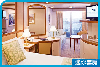 Mini Suite 艙內含陽台;另備有兩張單人床可合併為一張大號雙人床、獨立起居空間、沙發床、茶几、迎賓香檳酒、電視機(2台)、冰箱(1台)、大型衣帽間、浴缸、淋浴蓮蓬頭(具按摩功能)。