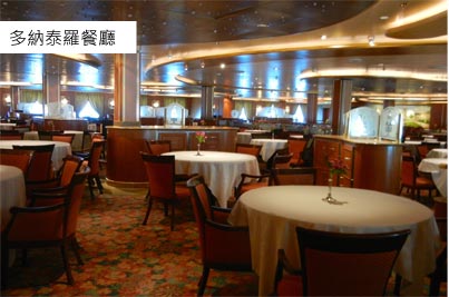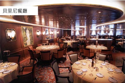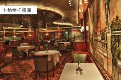 為您安排固定的用餐時間,晚餐享用正式5道式西餐,每晚皆由主廚設計不同的菜色,讓您每晚充滿驚喜,您可以在三間餐廳享用同樣的菜色,不需要為錯過美食而擔心。餐廳服務人員會於您入座後,非常親切為您介紹及推薦菜單上的美食佳餚,也有符合亞洲旅客口味的特色中餐,絕對不用擔心口味吃不習慣!