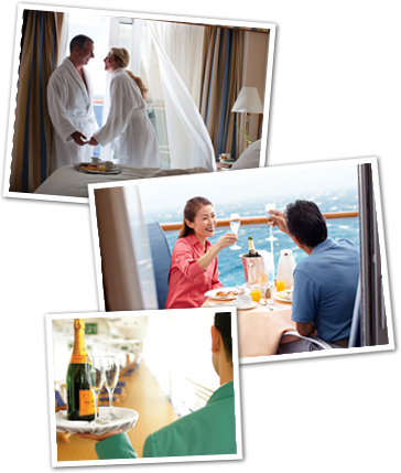 想在房間享用免費歐陸早餐的客房服務,只要前一晚將房間內的早餐卡填好,掛在門口外的門把上,就會依據您指定的餐點、時間送到房內,不出房門一樣也能輕鬆享用。若您住有陽台的艙房,還可以為自己點份「香檳早餐」包括法國香檳(半瓶)、法式鹹派、阿拉斯加鮭魚、酥皮派、新鮮水果等精緻餐點,您可以在陽台上與海景、日光、海風的陪伴下,品嚐最浪漫的藍色假期。(香檳早餐,須另外收費)