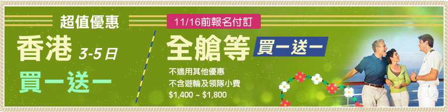 - 以上售價為遊輪船票費用+單程台灣至香港團體機票 ,含遊輪靠港稅及機場稅。