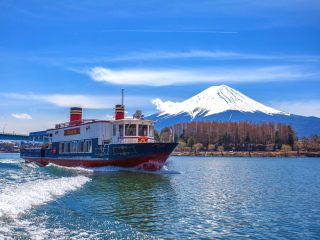 河口湖遊覧船1周約20分鐘。晴天時可欣賞雄大的富士山及欣賞360°的湖景。