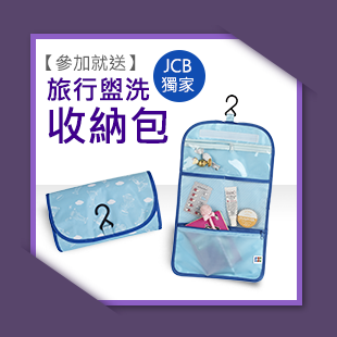 - 凡購買上述活動行程即贈送『JCB獨家旅行盥洗收納包』乙個,數量有限送完為止。