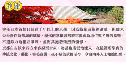 要說人氣第一的古都、花都,非列名世界遺產的清水寺清莫屬。清水寺建於西元798年,是平安時代建築物。曾經多次遭受祝融之災,目前所見的清水寺,是1633年時依照原貌重建的。清水寺以四季美景為名(春櫻、夏綠、秋紅、冬雪)。另有「清水的舞台」名氣響亮,從此眺望市區,景色美麗令人摒息。 |