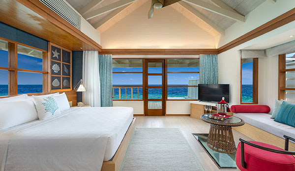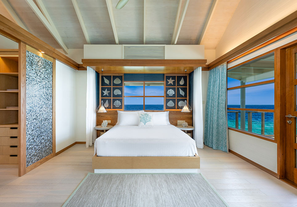 島上僅有68間私人獨棟別墅,分別坐落在沙灘島嶼及水上棧橋上。房內寬敞舒適的住宿環境、海洋風情的裝飾、柔和的原木色調,與簡約主義的設計搭配的相得益彰,浪漫的恰到好處。