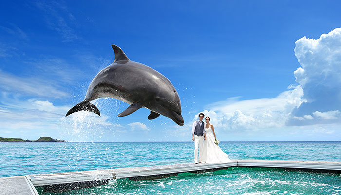 神聖的海濱教堂,環繞於幸福與湛藍海水間,清澈湛藍的海域,自由奔放的海島氣息,是戀人們心目中最浪漫的愛情天堂。最值得一提的是,婚禮儀式完成後,還可以安排和海豚一起拍攝獨一無二的婚紗照片,保證讓您永難忘懷。