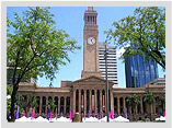【市政廳】布里斯本市政府建於西元1920年,挑高的天花板和具古典氣質的壁畫,是相當寶貴的歷史資產,被稱為「百萬市府」,一旁高92公尺的鐘塔是座華麗的文藝復興式建築。在頂端有個可以360度飽覽市區風光的觀景台,十分特別!