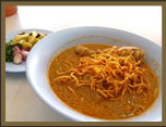 清邁當地獨有的美食,油炸的雞蛋麵條,加入以椰漿為底的咖哩湯頭;麵條吸足濃郁咖哩湯,仍酥脆不糊掉。加入炸豬皮,特別香氣口感,附著在裡面;您到清邁不容錯過的美味。