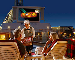 坐在露天泳池畔,一邊享用船上美食和飲品,一邊享受高清巨型屏幕展現的精彩娛樂節目,如體育賽事、熱門電影、好萊塢大片等等。