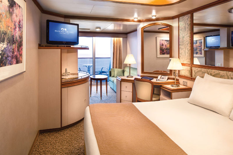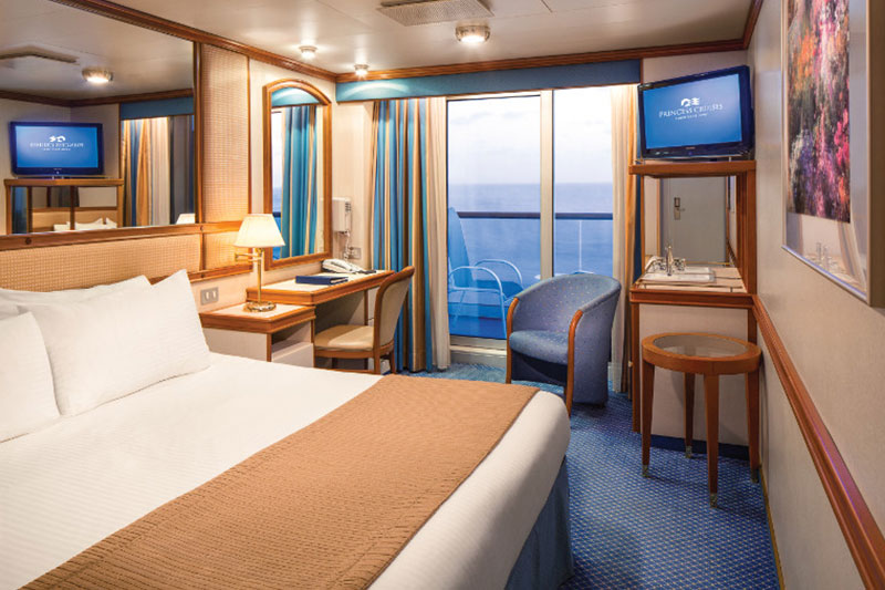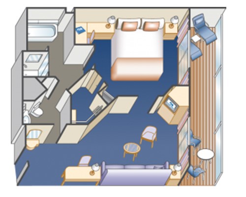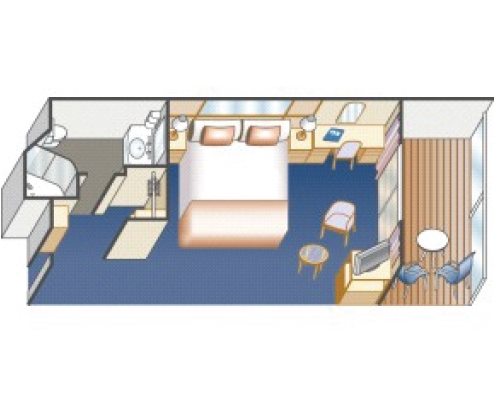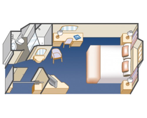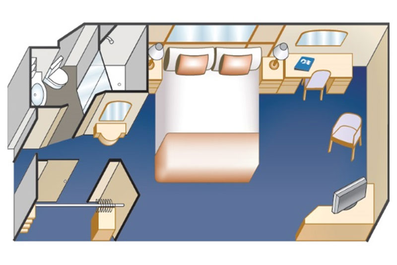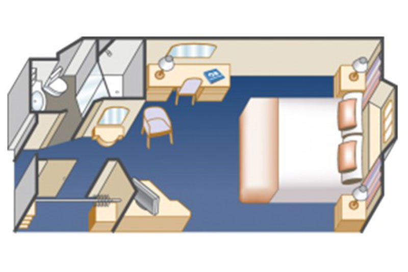 面積為5坪,精美奢華,內部設施一應俱全。0.7坪的私人陽台更為您帶來獨享的私人空間,讓您在艙房內盡情領略迷人海景。