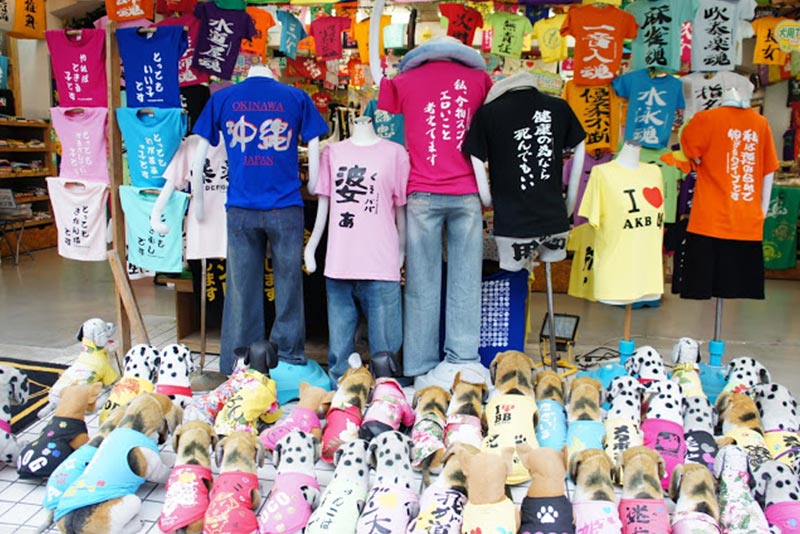 來到國際通會看見商店內掛著許多海人T恤,您也可以印上自己喜愛的文字做成您獨有的紀念品。
