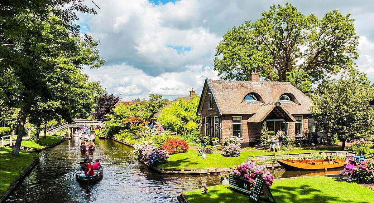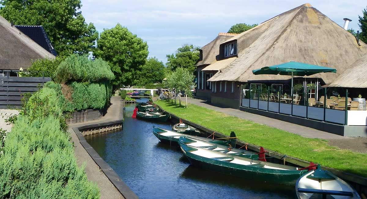 荷蘭西北方De Wieden 自然保護區內的羊角村Giethoorn;羊角村素有「綠色威尼斯」之稱,沒有汽車往來的紛擾吵雜,運河湖泊交織的美景中,餐廳位在蘆葦屋頂的綠色小屋旁,有著簡約溫馨的設計,搭配西式料理,一邊享用豐盛的美食,同時可欣賞小巧樸實的漁村美麗風情。※圖片僅供參考
