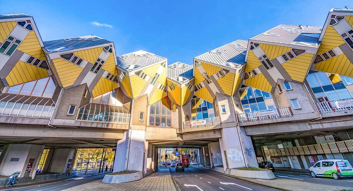 荷蘭最具代表性的現代建築「立體方塊屋」,由著名設計師Piet Blom設計打造,由一塊塊傾斜45度並各自相連的正立方體空間組成,每塊立方體都是一個住宅或辨公場地,充分展現前衛藝術設計與空間完整利用的概念,設計師以森林為概念,一整排的方塊屋就像一座森林。