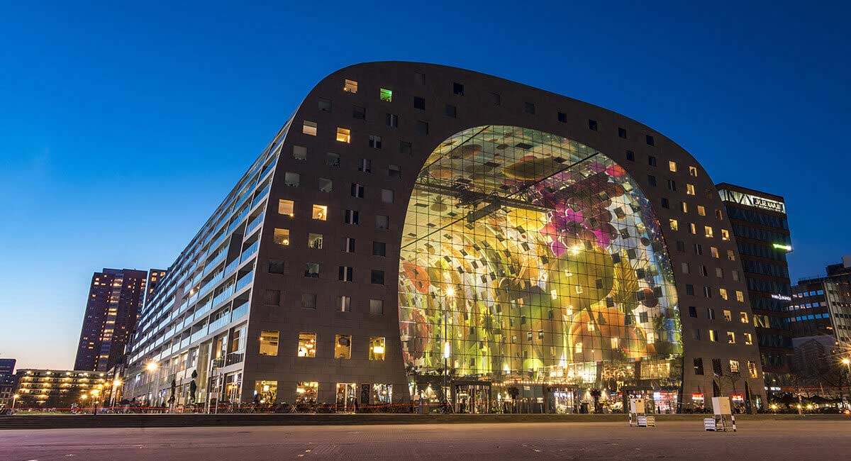 由荷蘭知名建築團隊 MVRDV 操刀設計的 Markthal綜合市集 ,這裡聚集了上百個美食攤位,以及多間商店與餐廳,更有1000 平方公尺的巨型彩繪壁畫牆,2014年開幕至今,已經成為世界矚目的焦點,英國《衛報》更將 Markthal 市集選為歐洲十大美食廣場之一,是遊客必去景點之一。
