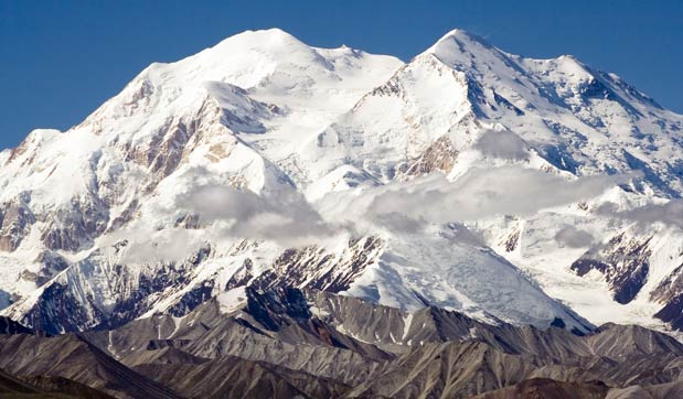 北美洲最高峰-阿拉斯加山脈主峰-麥金利山(Mt. Mckinley),海拔6174公尺,麥金利山地區擁有變幻莫測的高山風、典型的北極植被以及野生動植物。山頂終年積雪,氣候變幻莫測,全年中有70%時間被雲霧所繚繞瀰漫。麥金利山巍峨壯碩,當天氣許可,一剎那間雲霧散去,那麼麥金利山將巍巍矗立在您眼前。
