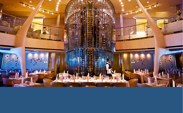 擁有兩層甲板高的玻璃酒塔及令人目眩神迷的吊燈,世界各地創新的美食及專業服務,讓您的美味佳餚的更臻完美。(免費餐飲)