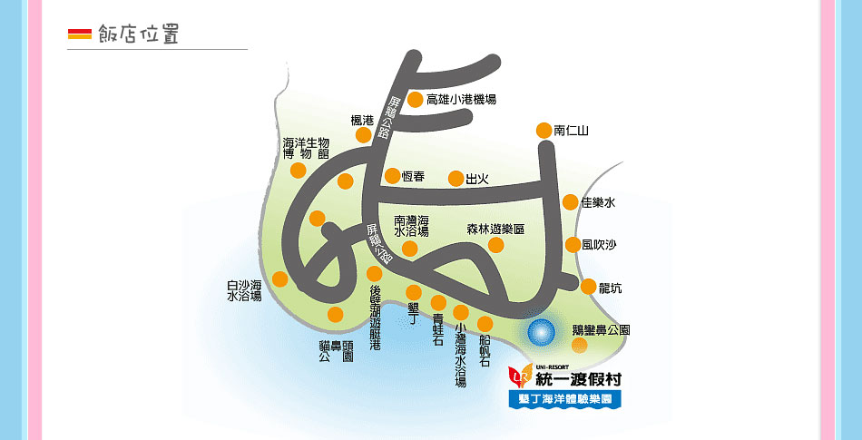 墾丁的海水,有一抹炫惑的藍,空氣中透著椰林的氣味,輕柔的沙粒滾進了悠閒踱著的鞋底,手腕上的錶也放假了!紅瓦白牆的地中海式建築,讓您徜徉在碧海藍天與椰林的氣息中,享受著陽光、沙灘、觀星、戲水的樂趣。園區內的高空滑水道、人工造浪池、親子戲水池、射箭場、攀岩場等,絕對讓您玩得盡興,帶回一籮筐的歡樂回憶!