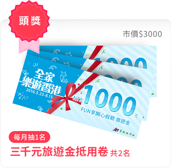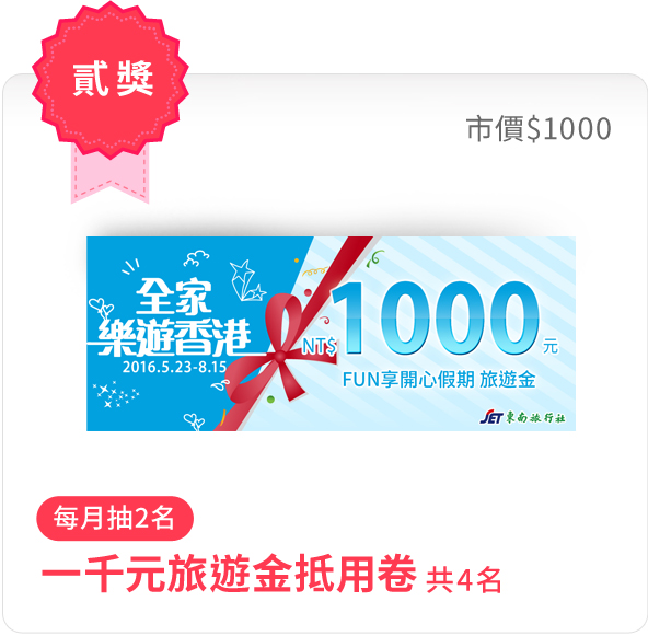 凡於活動期間 : 2016.05.27(五) - 2016.08.15(一),週末時段 每週五 18:00 起至隔週一 08:00 止,至活動網頁下單付訂東南旅遊週末購指定商品,可享超值優惠價,完成線上付訂並全額付款者,就可參加抽旅遊金活動!於 2016 年 7 月 4 號及 8 月 15 日,分兩次抽出獎項。