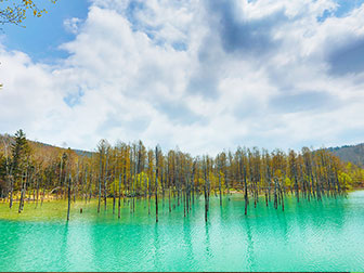 夏季的美瑛青池在太陽映照下,更加閃爍耀眼。隨著環境的細微變化,而呈現各種不同色澤,就算只是徐徐微風,也會影響其景緻,無風時就像是一面鏡子一樣。如此的美景將會美到讓人說不出話來。