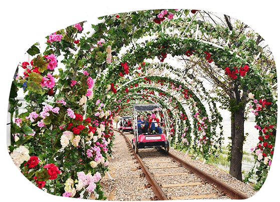 是目前韓國唯一環湖鐵道自行車,全程4.3公里。悠閒的踩著踏板,湖面上徐徐微風迎面吹來,感覺煩惱都被風吹散,好不愜意。