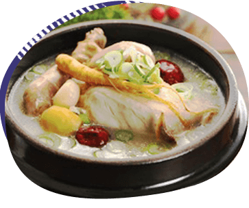 為朝鮮半島的傳統名菜之一。以全隻嫩雞、腹中塞入糯米、佐以紅棗、薑、蒜和人蔘長時間燉煮製成,雞肉有溫中益氣、補虛益智的作用。湯底共使用了30餘種的漢藥材熬製,香醇濃郁才能完成一碗特製的美味蔘雞湯。