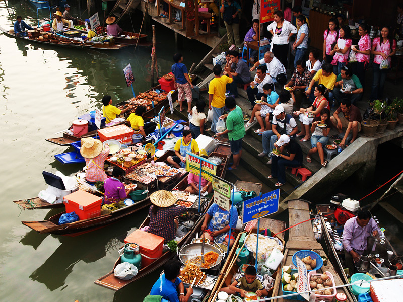 市集周五六日最為熱鬧,商家點起魚鱗般燈火,水上岸上行人摩肩擦踵。五金雜貨、水果花卉園林、農作產品等等;買賣么喝如火幟進行,小吃甜點海南雞米粉湯哩哩辣辣;這就是泰國最傳統的黃昏水上夜市序幕。