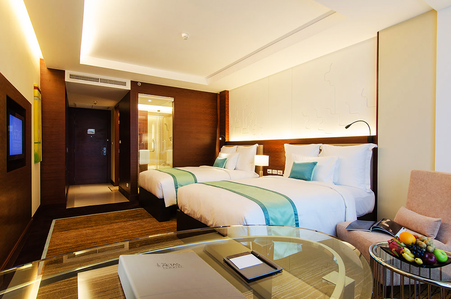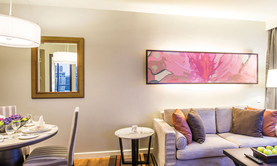 單臥室套房位於第4–12層,擁有64平方米現代化設計空間。步入您的私人陽臺欣賞城市風景,或在客房內透過落地玻璃窗品味眼前美景。時尚的臥室擁有寬敞的衣櫃和行李存放空間、國際衛星純平電視以及一張特大雙人床或兩張單人床,皆鋪有豪華床品,可選鴨絨枕頭或突觸纖維枕頭。浴室配備雨淋式花灑和單獨浴缸,通過拉門與臥室連通。用餐區設有四人餐桌,每間客房均配備烤麵包機、茶具和咖啡機。相連生活區有一張舒適的沙發、第二臺國際衛星純平電視和一個工作臺。