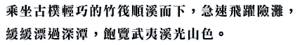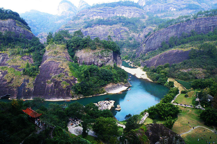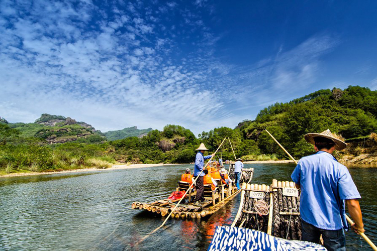 溪流繞著青山,彎彎曲曲的折成9段,每一段都是風景,四曲處是《西遊記》拍攝小白龍出世的地方。九曲溪漂流很有名氣。坐竹筏游覽,從九曲到一曲順流而下,隨波逐流。